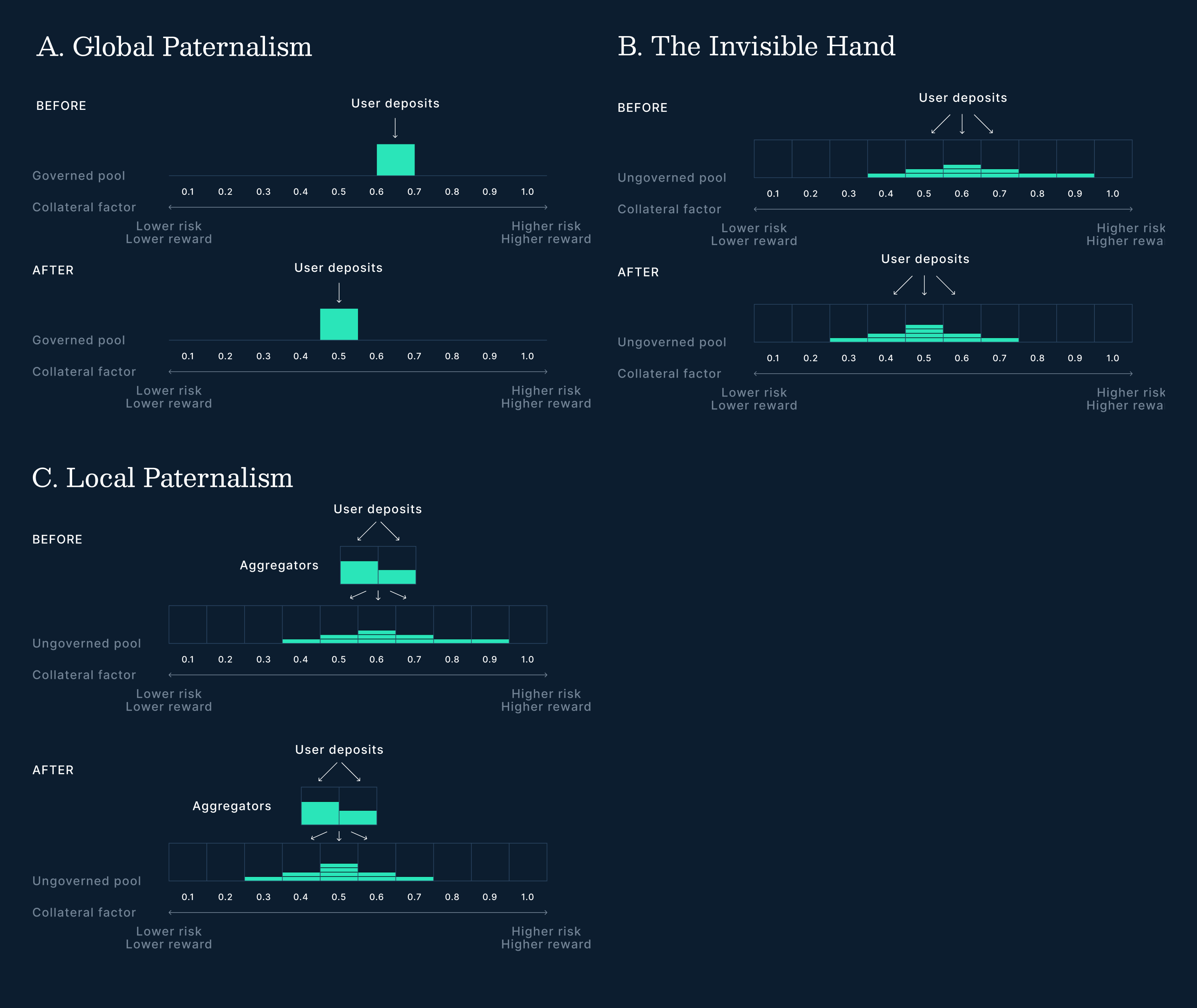 Figure 1 | Liquidity and risk management models. In A, under global paternalism, lenders all deposit to a single governed pool. The collateral factor setting the required loan-to-value (LTV) ratio for borrowers is determined globally in a paternalistic manner. If the risk environment deteriorates, then governance may opt to lower the LTV for the entire protocol from a higher value (Before) to something lower (After). This model allows lenders, and to some degree borrowers, to hold open positions in a relatively passive manner. In B, under the invisible hand, lenders deposit directly into a range of pools with different fixed risk parameters. In this model, if the risk environment deteriorates, lenders must actively pull deposits from higher risk pools themselves (Before) and manually move them to lower risk pools (After). This model allows lenders maximum flexibility into where they put their deposits, and helps them avoid fees and the risks of bad governance, but still requires borrowers to actively manage opening and closing loans across different pools. In C, under local paternalism, lenders deposit into pools with different fixed risk parameters via an aggregator. The aggregator may opt to put a small percentage of their liquidity into higher risk pools and some in lower risk pools. Aggregators compete against each other for deposit customers based on their ability to manage risk and deliver a reward. If the risk environment deteriorates, they will pull deposits from higher risk pools (Before) and move them to lower risk pools (After). This model allows lenders to deposit passively into the aggregator of their choosing and have risk/reward managed for them, but still requires borrowers to actively manage opening and closing loans across different pools.